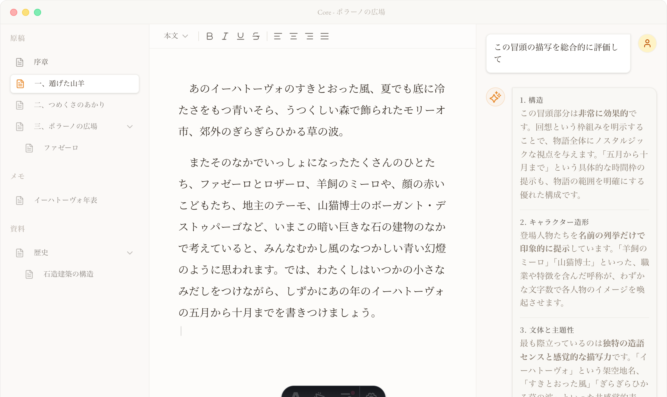 Coreのファイルツリーは、原稿、メモ、資料など、あらゆるファイルを直感的に整理できます。